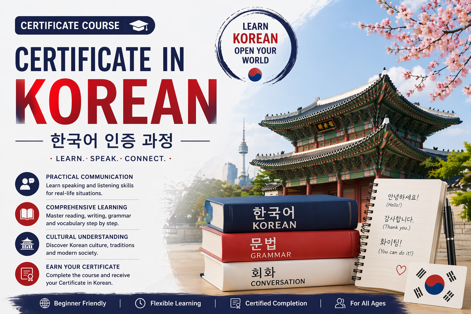 A certificate-level course designed to develop basic Korean language skills for communication and practical use.