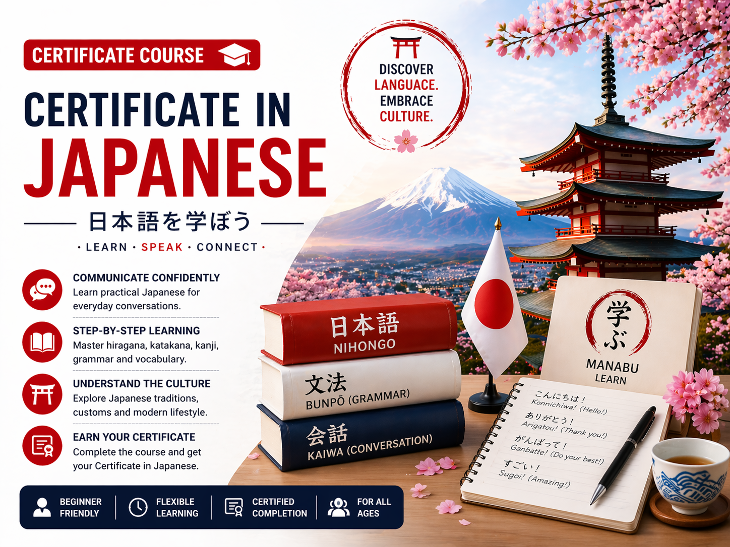 A certificate-level course designed to develop basic Japanese language skills for communication and practical use.